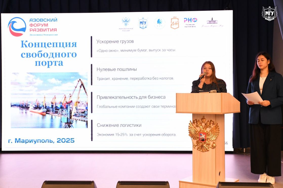 В рамках программы форума представители факультета права НИУ ВШЭ совместно с коллегами из МГУ имени А.И. Куинджи провели презентацию стратегического проекта по развитию Мариупольского морского торгового порта в качестве транспортного хаба. В команду проекта вошли студенты факультета права НИУ ВШЭ — студентка 5 курса образовательной программы бакалавриата «Юриспруденция» София Гинзбург и студентка 3 курса Анжелика Джаин, а также их коллеги из Московского государственного университета имени А.И. Куинджи: студентка 4 курса бакалавриата Алина Андрусенко, студентки бакалавриата Полина Мадина и магистратуры Яна Щуренко, — и все это под руководством к.ю.н., заместителя декана по учебной работе, доцента департамента правового регулирования бизнеса факультета права НИУ ВШЭ Александры Касаткиной и при научном консультировании заместителя начальника отдела мореплавания Департамента государственной политики в области морского и внутреннего водного транспорта Министерства транспорта Российской Федерации Валерии Жук и старшего преподавателя департамента правового регулирования бизнеса факультета права НИУ ВШЭ, Главного юрисконсульта Центра правового сопровождения срочного рынка и клиентских операций коммерческого банка Дмитрия Максимова, в результате чего данная инициатива получила высочайшую оценку экспертного сообщества, включая главу региона Дениса Пушилина.